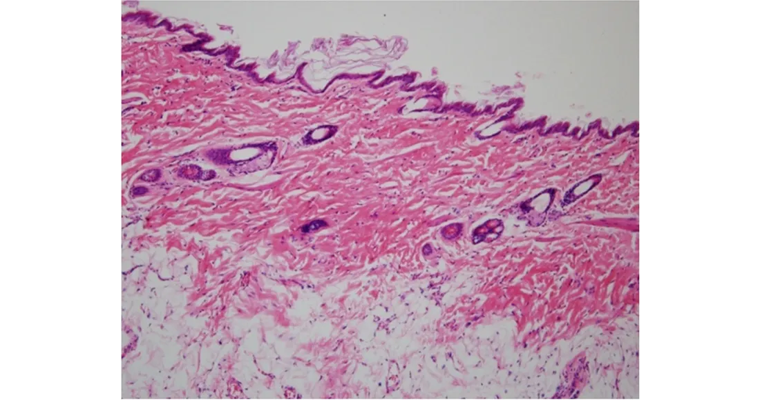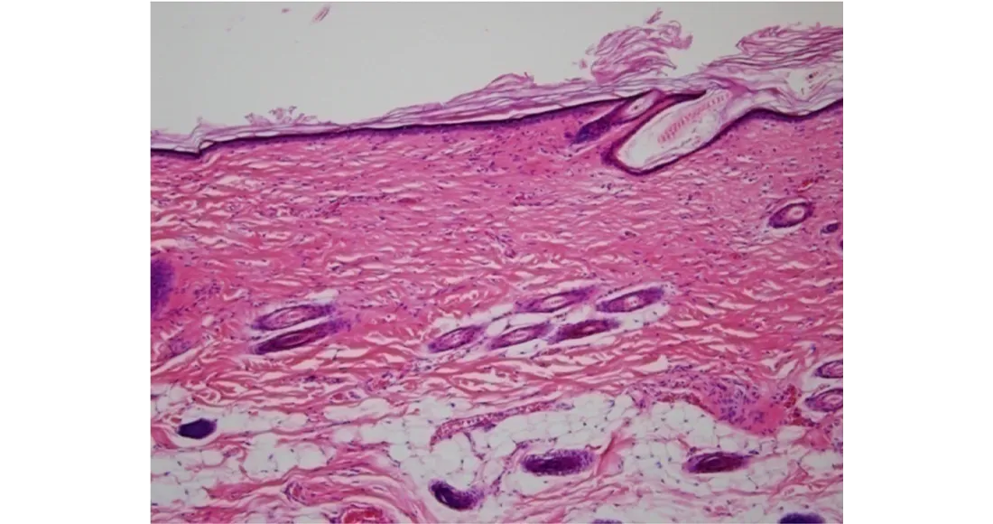 シャイニングピール照射3ヶ月後、コラーゲンとエラスチンの組織の数が増えて、真皮層の厚みがましているのが分かります。