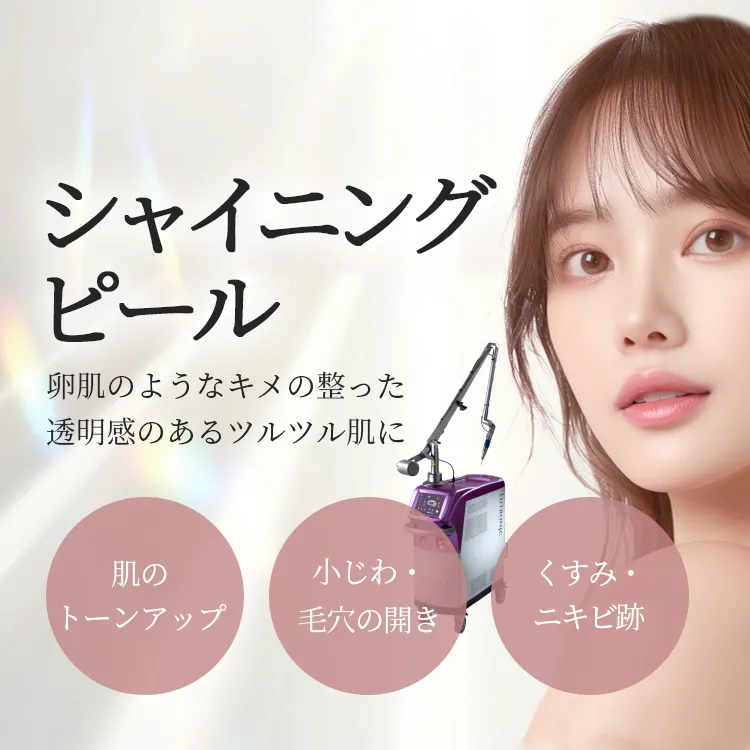 シャイニングピール治療のメリットは、皮膚の外層を保つため、術後も紫外線による色素沈着のリスクを抑えられ、日常生活に影響を与えない点にあります。時間とともに皮膚の外層が自然に剥がれ落ちるため、無理なく手軽に受けることができる美肌治療です。