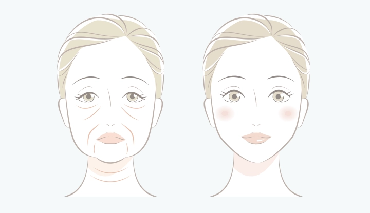 年齢を重ねるにつれて、顔全体のたるみは少しずつ進行していきます。頬が下がり、フェイスラインが曖昧になり、口元や目元に深いしわが刻まれるようになると、実年齢以上に老けた印象を与えてしまうことも…