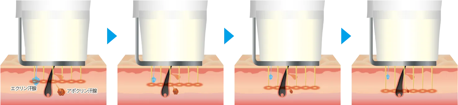 皮膚表面は冷却システムによって保護され、カートリッジの先端には36本の極細の照射針がついており、異なる深さにある汗腺組織にまで到達します。針の先端から高周波による熱エネルギーが照射され、ピンポイントで汗腺組織だけを焼灼・破壊することで、汗や臭いを抑える新しいワキガ・多汗症治療機器です。