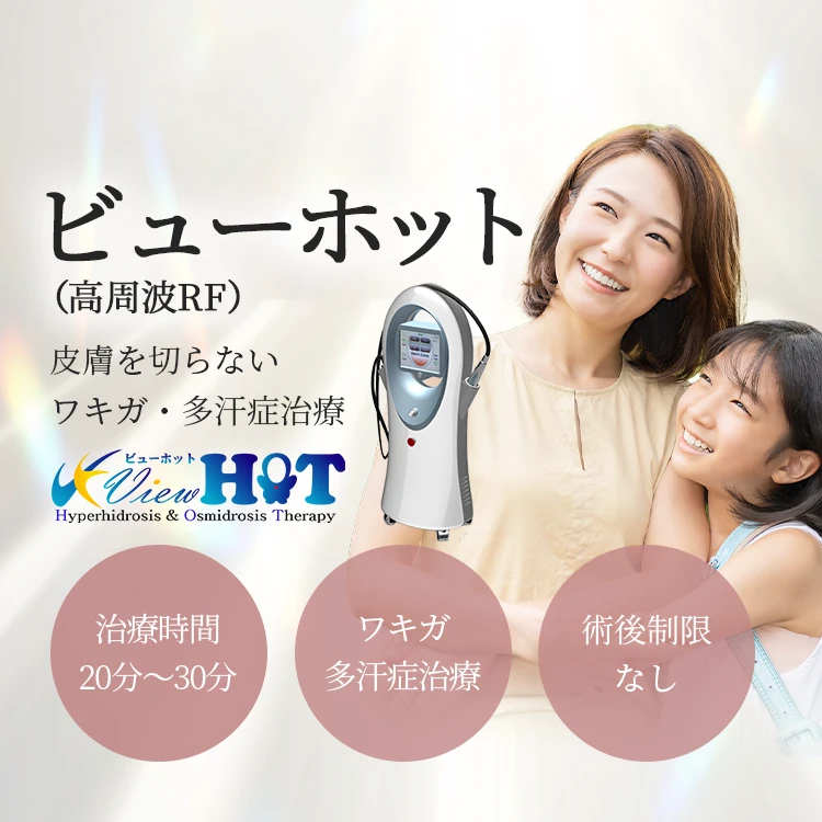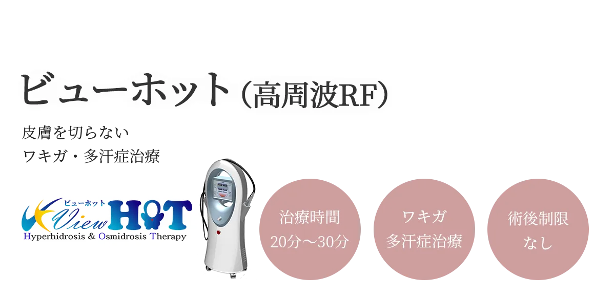 ビューホットは、治療用に設定された高周波(RF)によって切らずにワキ・手のひら・足裏・乳輪周囲・デリケートゾーン(VIO)のワキガや多汗症を治療する機器です。