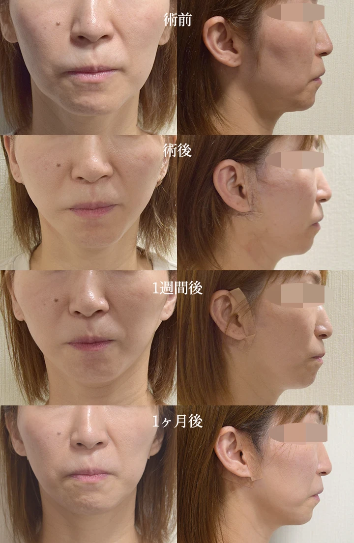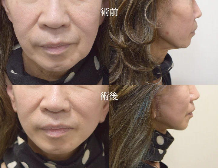 施術方法は、皮膚を引き上げて余分な部分を切除し、筋膜をしっかりと引き上げることで、若い頃のようなハリを取り戻します。切開は耳の内側に沿って行い、傷跡が目立たず、仕上がりが美しくなります。