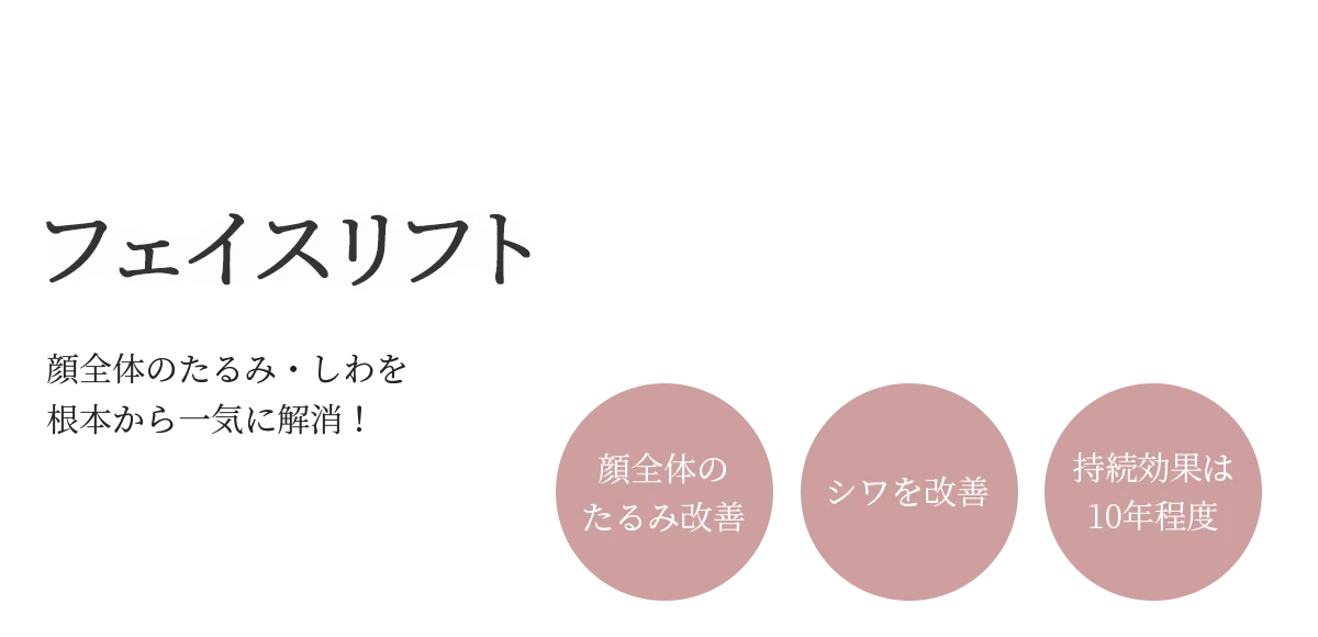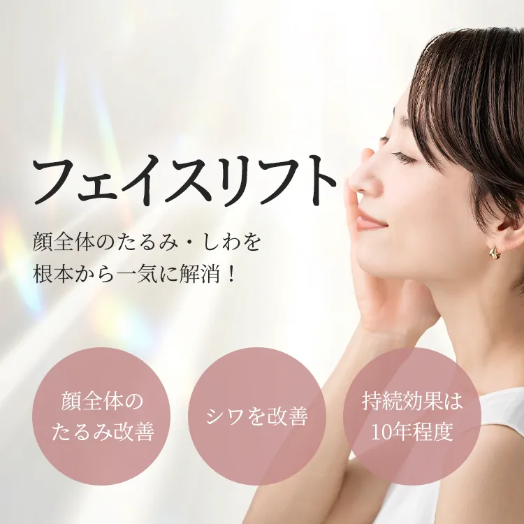 フェイスリフトは、顔全体の”しわ”や”たるみ”のお悩みを一気に解決する、トータル的なリフトアップ術です。